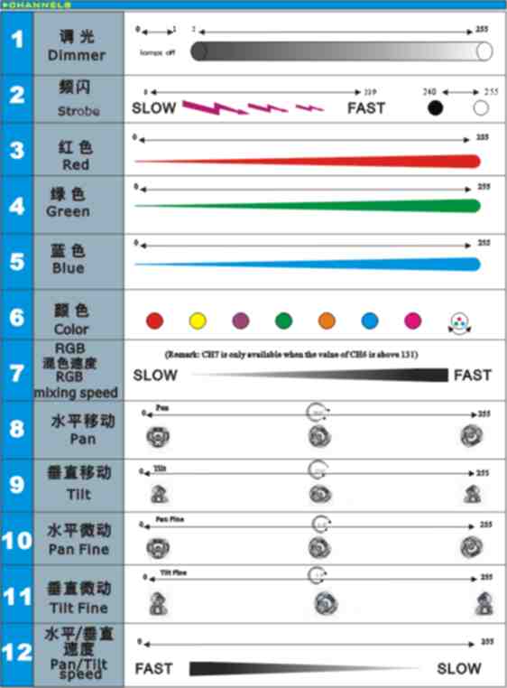 Voltage:AC 100-240V,50-60Hz Lamp:1W Red*28+1W Green*28+1W Blue*28 3W Red*28+3W Green*28 +3W Blue*28 Rated Power:150W/300W Control signal:DMX 512/Master-slave/ Auto/Custom/Sound Control Channels:Advanced(12CHs)