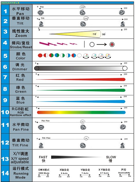 Voltage :AC 90-130V/180V-245V, 50/60Hz Lamp : 108*1W/3W RGB Rated Power: 108W/324W Control Signal : DMX 512/Master-slave/ Auto/Custom/Sound Control Channels : 14CH Size: 380 x 350 x 450 mm Weight: 12.0kg