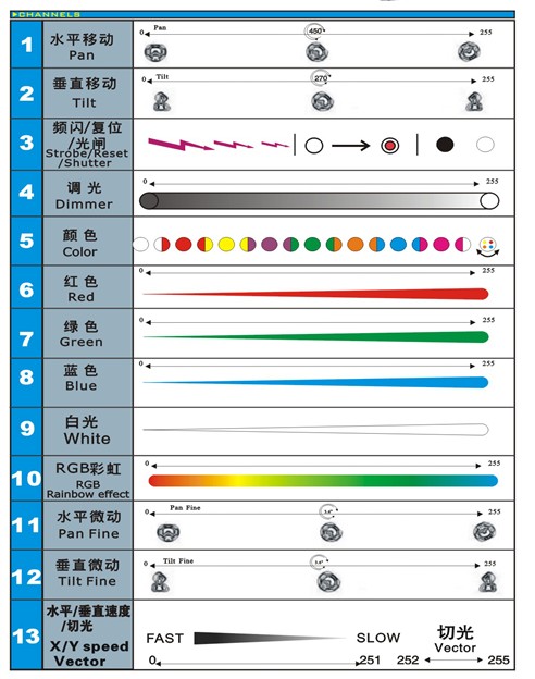 ·DMX-512 control signal, 15 standard channels.