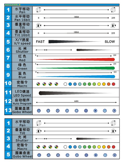 • DMX channels: 13CH/5CH DMX 512• Pan 5400 /Tilt 2700