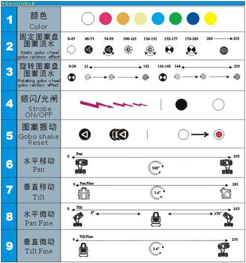 工作电压:220v 50Hz/60Hz 灯泡:MSD 250w 功率:350w 控制信号:DMX 512 图案盘:7图案 + 白光 色盘:7色 + 白光