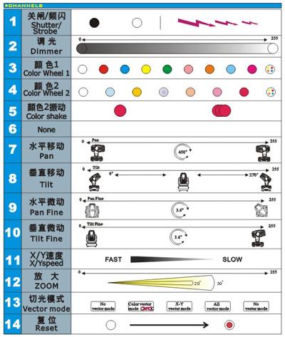 工作电压:220V/50Hz 光 源:MSD 250W 耗电功率:400W 通道信号:DMX 512 色 盘:8色 + 白光