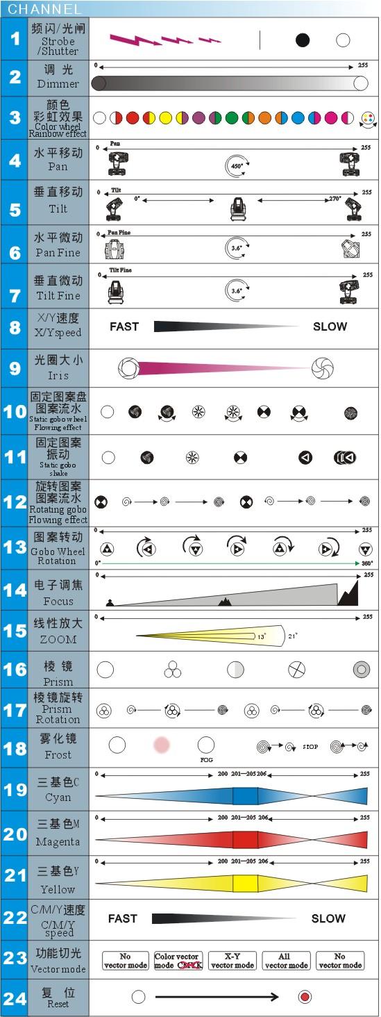 工作电压:220v 50Hz/60Hz 总功率:1500w 控制信号:DMX 512 固定图案盘: 4图案 + 白光 旋转图案盘:4图案 + 白光 色盘:7色 + 白光 棱镜盘: 2棱镜 +4棱镜 + 半梯形镜 + 半柱形镜 + 雾化